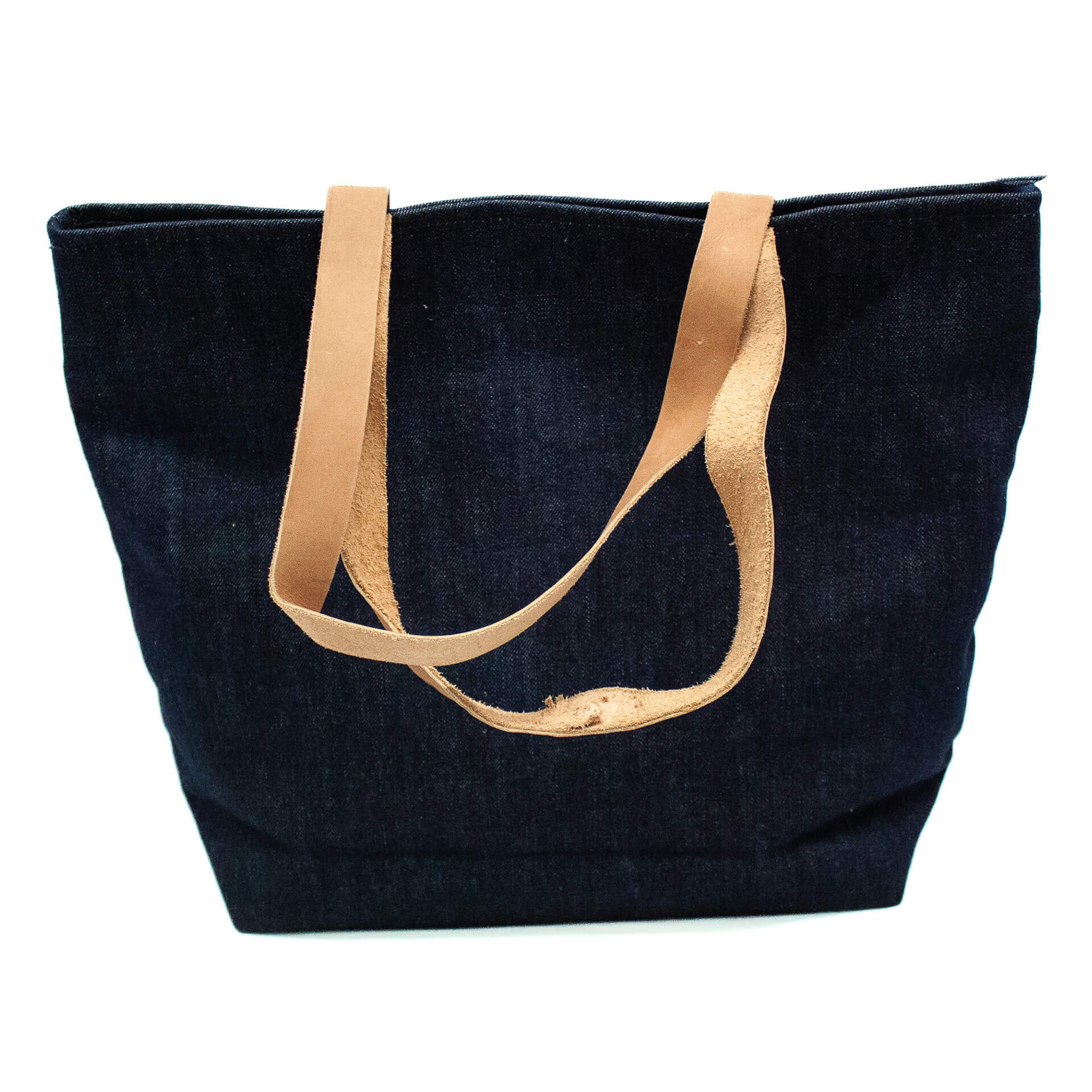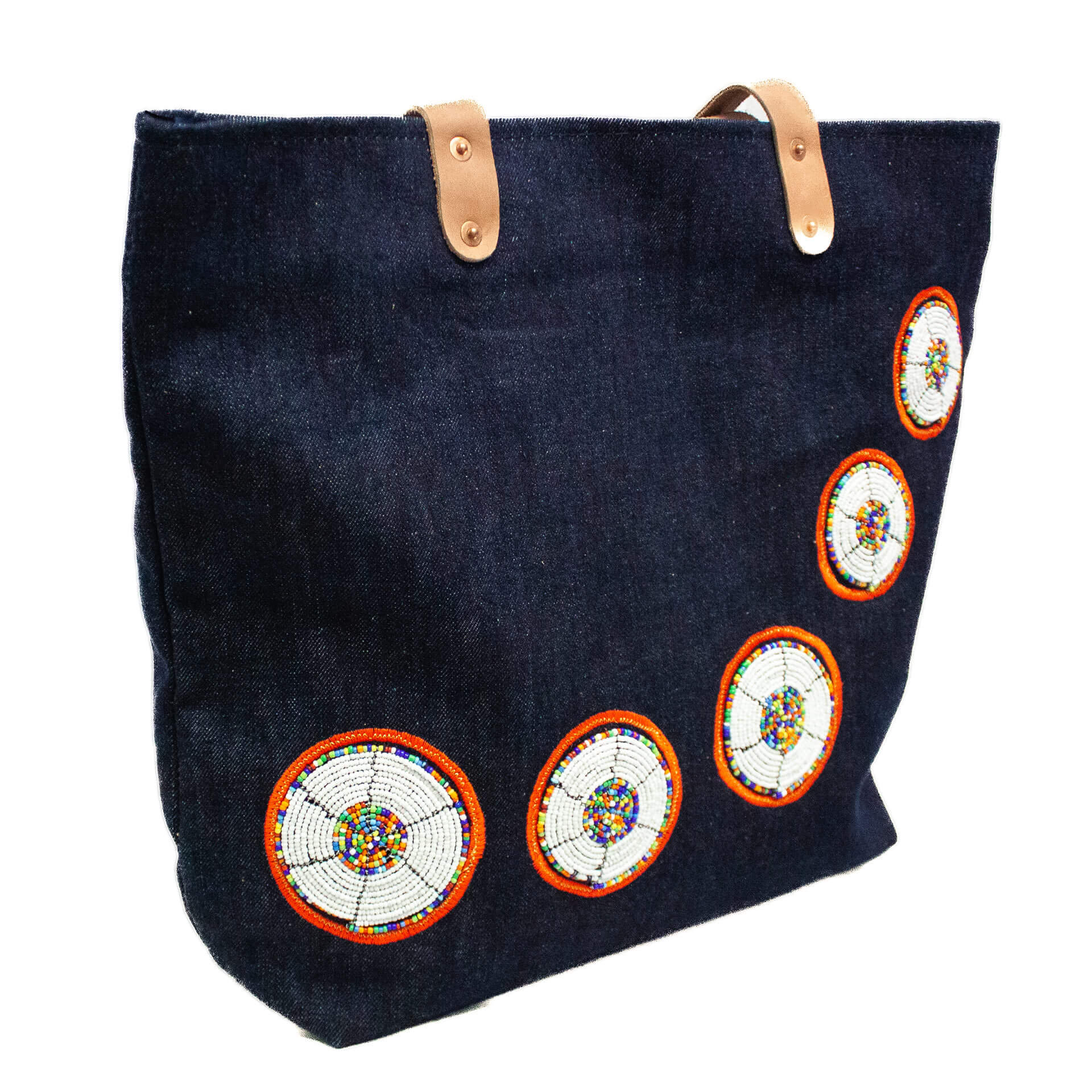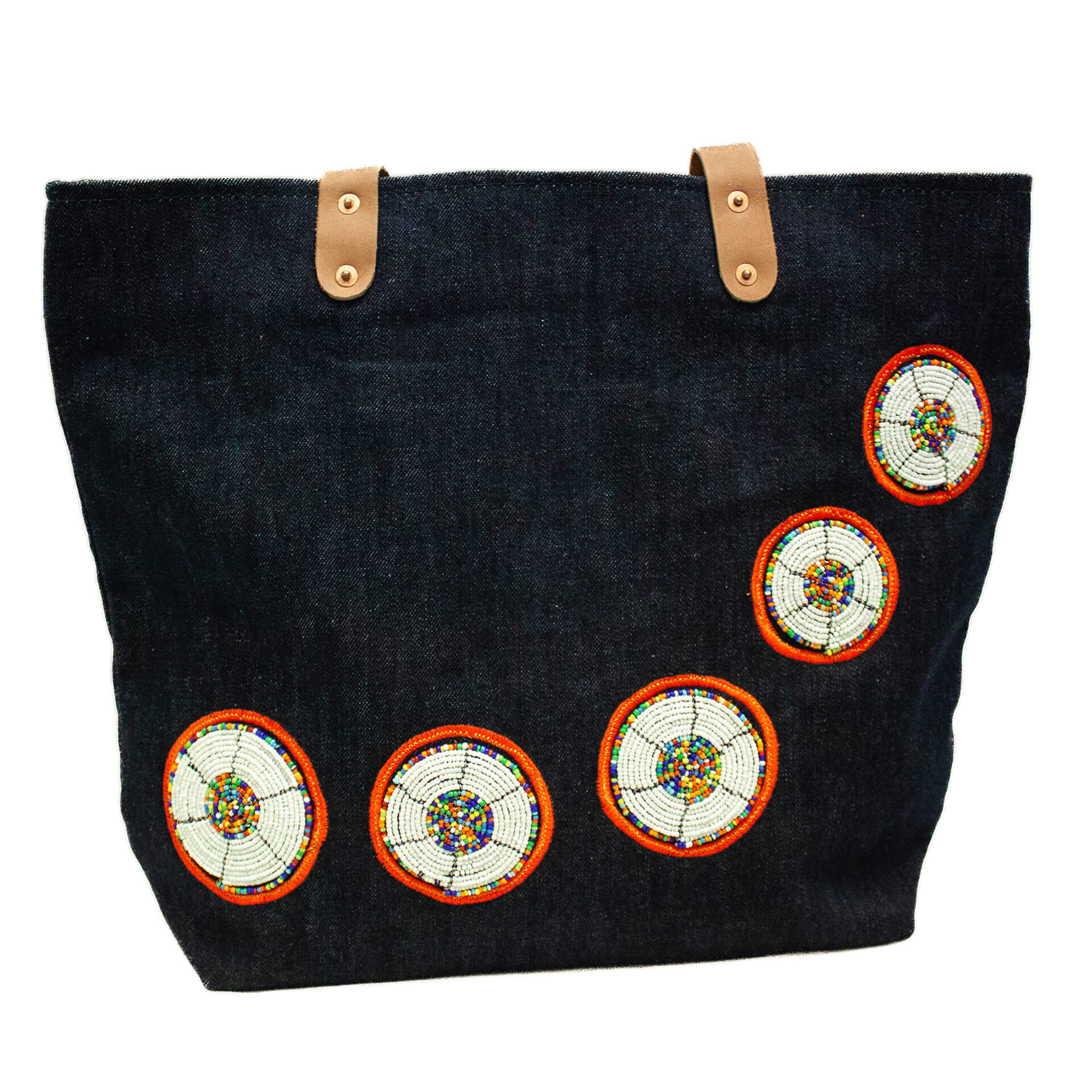 Dark Denim canvas Mkoba Tote with Red, White & Multi color curved beadwork