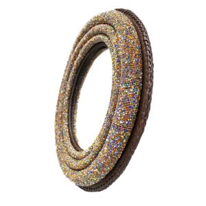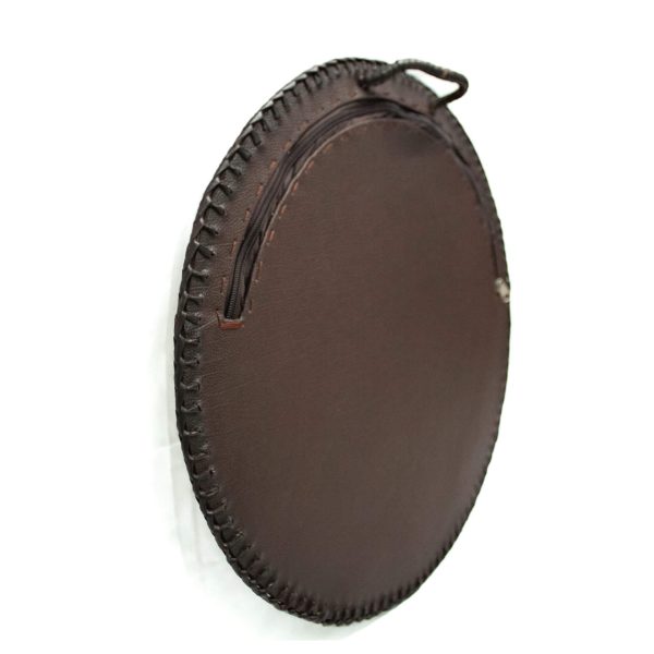 African decorated round mirror with uniquely crafted intricate beadwork.  Contains a round leather multi-functional casing for the mirror or can be converted to insert a clock or picture.
